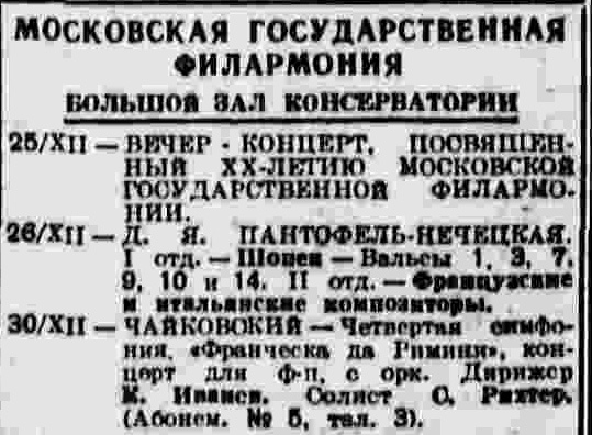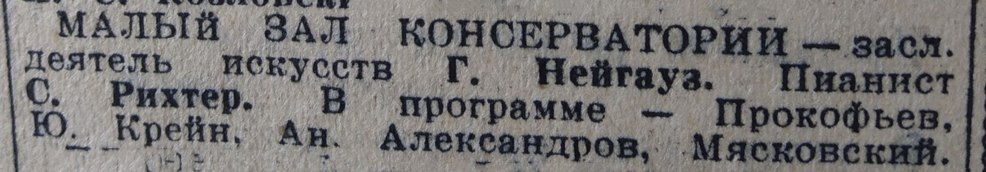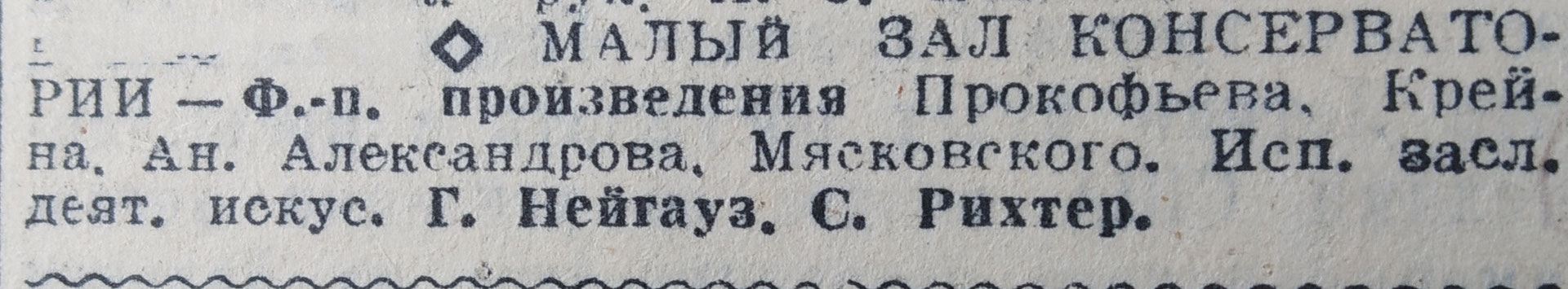 Сегодня в театрах: Концерт Г.Нейгауза и С.Рихтера (26/11/40). «Известия», 26/11/40.