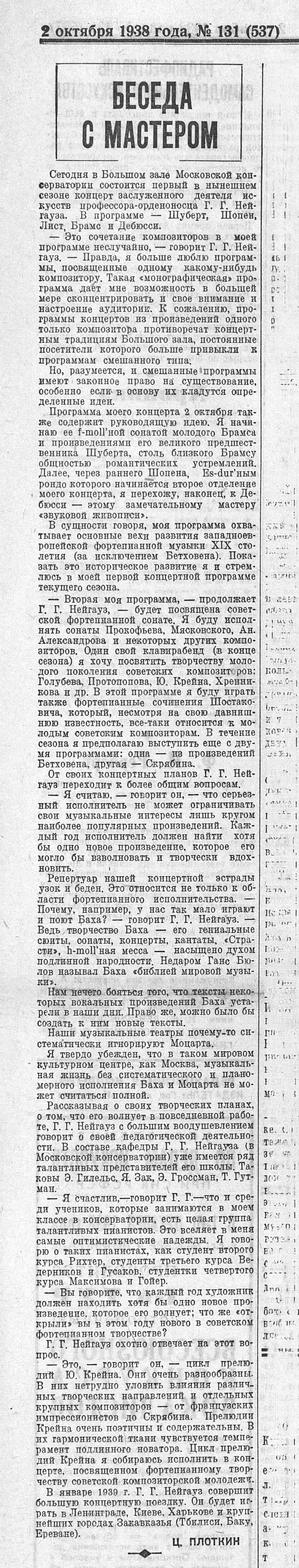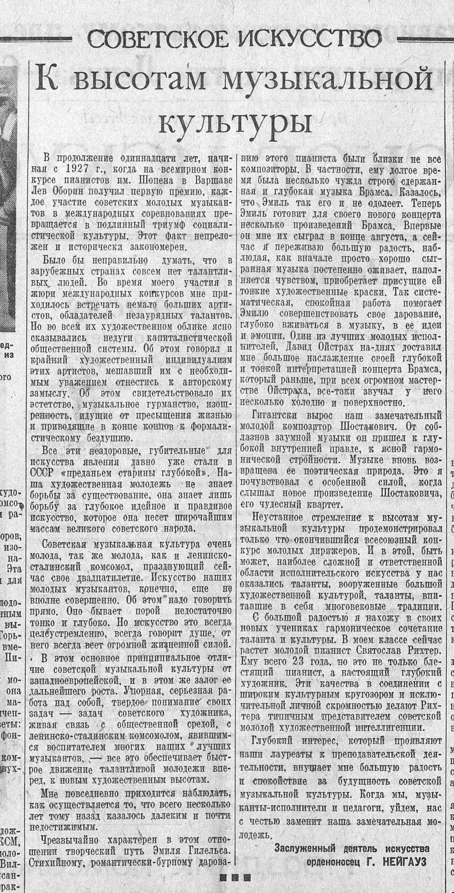 Г.Нейгауз. «К высотам музыкальной культуры». «Советское искусство», 30/10/38.