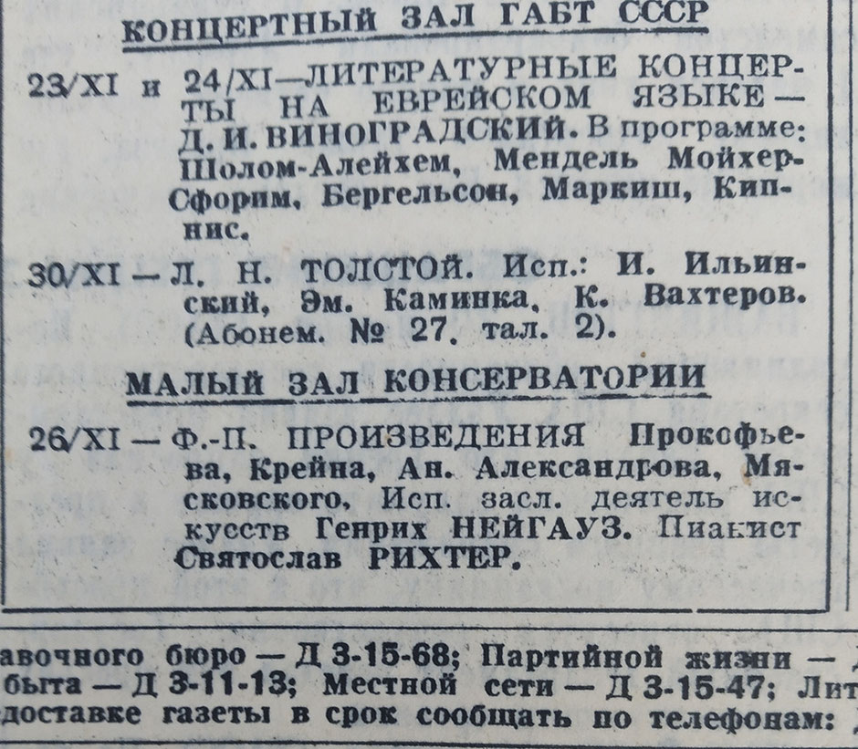 Сегодня в театрах: Концерт Г.Нейгауза и С.Рихтера (26/11/40). «Правда», 26/11/40.