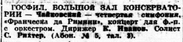 Сегодня в театрах ("Известия"): БЗК. Концерт С.Рихтера и оркестра под управлением К.Иванова. «Известия», 30/12/40.
