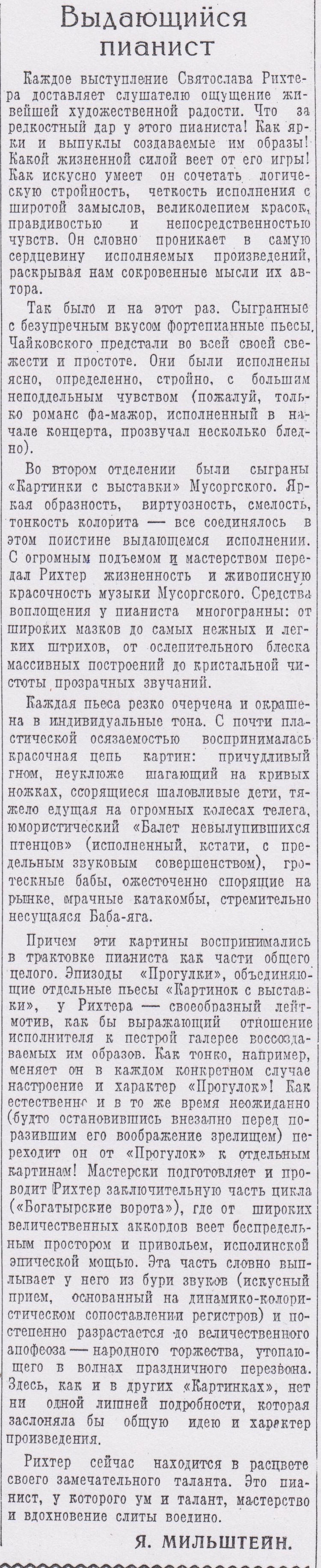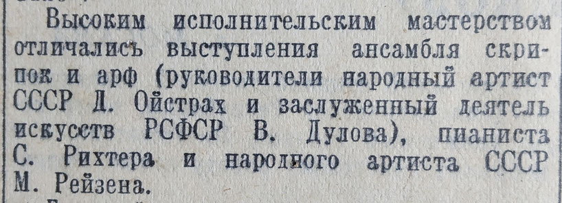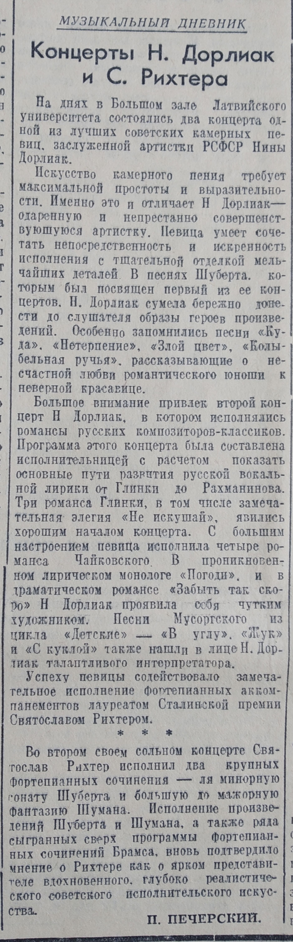 П.Печерский. «Концерты Н.Дорлиак и С.Рихтера». «Советская Латвия», 20/12/53.