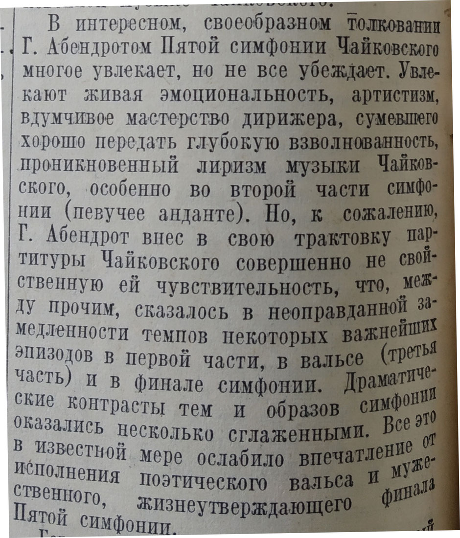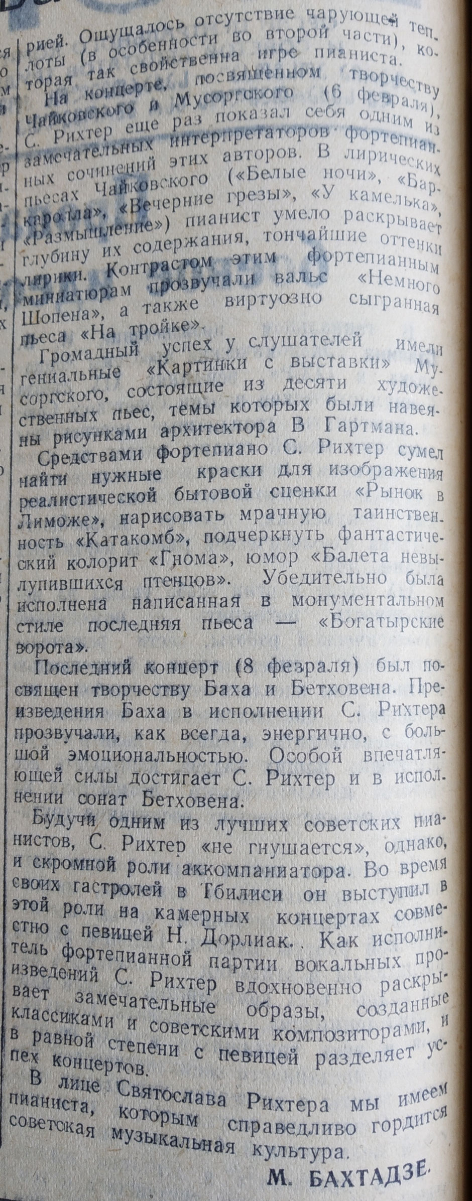 Кульминационным моментом концерта оказалось выступление во втором отделении пианиста Святослава Рихтера с первым фортепианным концертом Чайковского. Яркая индивидуальность, высокая артистичность и самобытность дарования С.Рихтера придали особую прелесть исполнению концерта. Цельность формы и тонкое понимание стиля Чайковского, прочувствованность и выразительность, размах и задушевная искренность отличали игру пианиста. Все удалось ему: и мощное, торжественное вступление, и динамическая жизнеутверждающая первая часть, и обаятельные, мягкие лирические мелодии первой и второй частей, и труднейшие для исполнения прозрачные, изящные скерцозные эпизоды второй части и, наконец, светлые жизнерадостные образы экспрессивного, виртуозного, стремительного финала концерта. Проникновенно и чутко аккомпанировал пианисту оркестр.